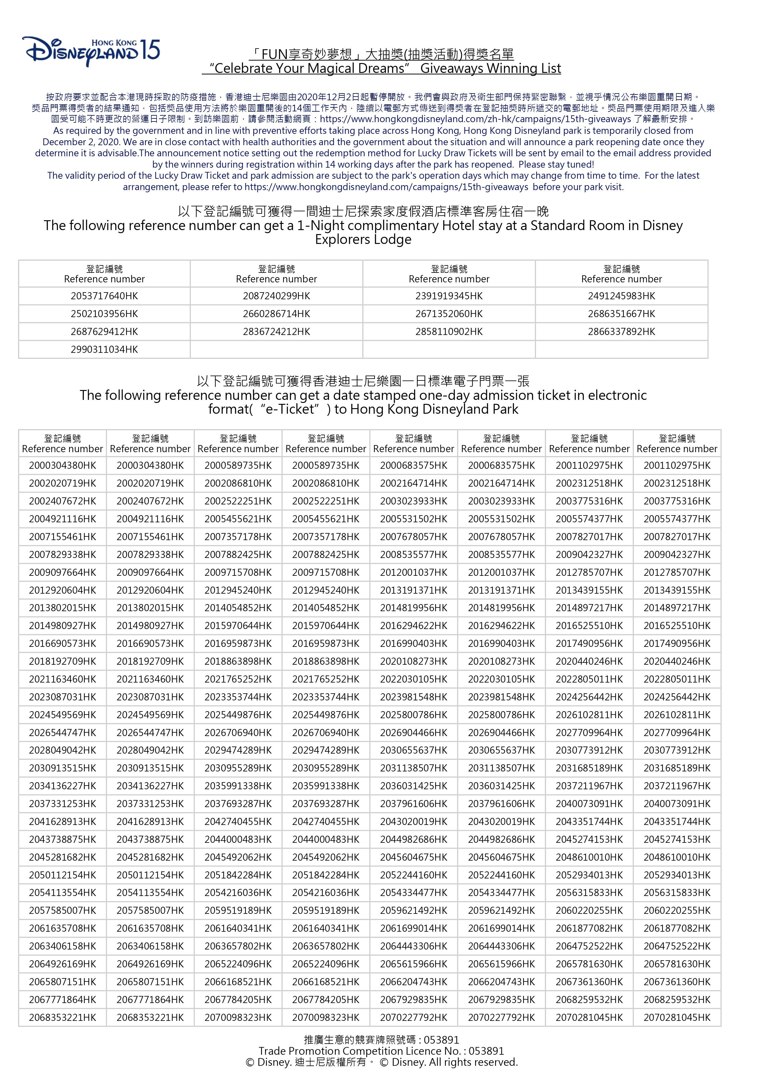 Expand by pressing enter key or collapse by pressing escape. 得獎結果公佈 - 如您的登記編號出現於公佈的得獎名單上代表您已經中獎 - 得獎通知會以電郵方式傳送至得獎者登記的電郵地址 - 得獎者可獲香港迪士尼樂園標準一日門票一張每張獎品門票均不能轉讓轉售替代全部或部分或兌換成現金或其他物品. 香港迪士尼樂園官方Facebook專頁提供度假區最新消息及活動資訊Get the latest Resort news and event information here at the official Facebook.