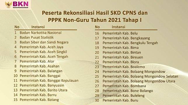 Hasil SKD dan SKB akan diakumulasi untuk menentukan siapa yang lolos seleksi. Total ada sekitar 25 instansi kementerian yang. Badan Kepegawaian Negara BKN telah menerbitkan jadwal seleksi baru melalui Surat Kepala BKN Nomor 13515B-KS0401SDK2021 tentang Jadwal Lanjutan Seleksi Penerimaan CPNS dan PPPK Non Guru Tahun 2021.